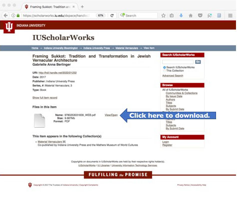 As I noted in discussing the edited collection Material Vernaculars: Objects, Images, and Their Social Worlds last fall, it is my hope that many readers will purchase a beautiful paper or hardback edition of Framing Sukkot, thereby helping support the work of a great university press. One of the things that makes IU Press great is its commitment to building strategies for free and open access to scholarly writings. The Material Vernaculars series, co-published with the Mathers Museum of World Cultures, is part of that commitment. So, first let me note that you can buy copies of the book from a range of online booksellers, including Amazon and the IU Press itself. Secondly, let me show you where the free digital edition of the book lives. Hopefully by the time Sukkot ends, people around the world will be reading this great new book.