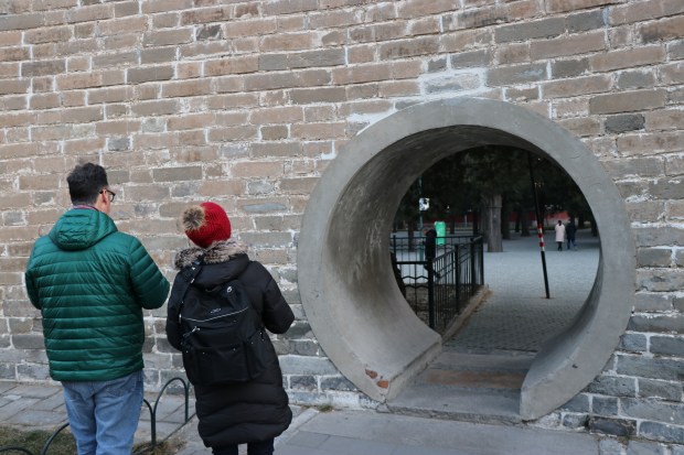 (L-R) Jason Jackson and Carrie Hertz contemplate scratching and not scratching at the Temple of Heaven in Beijing. December 8, 2017. Photograph by Jon Kay.