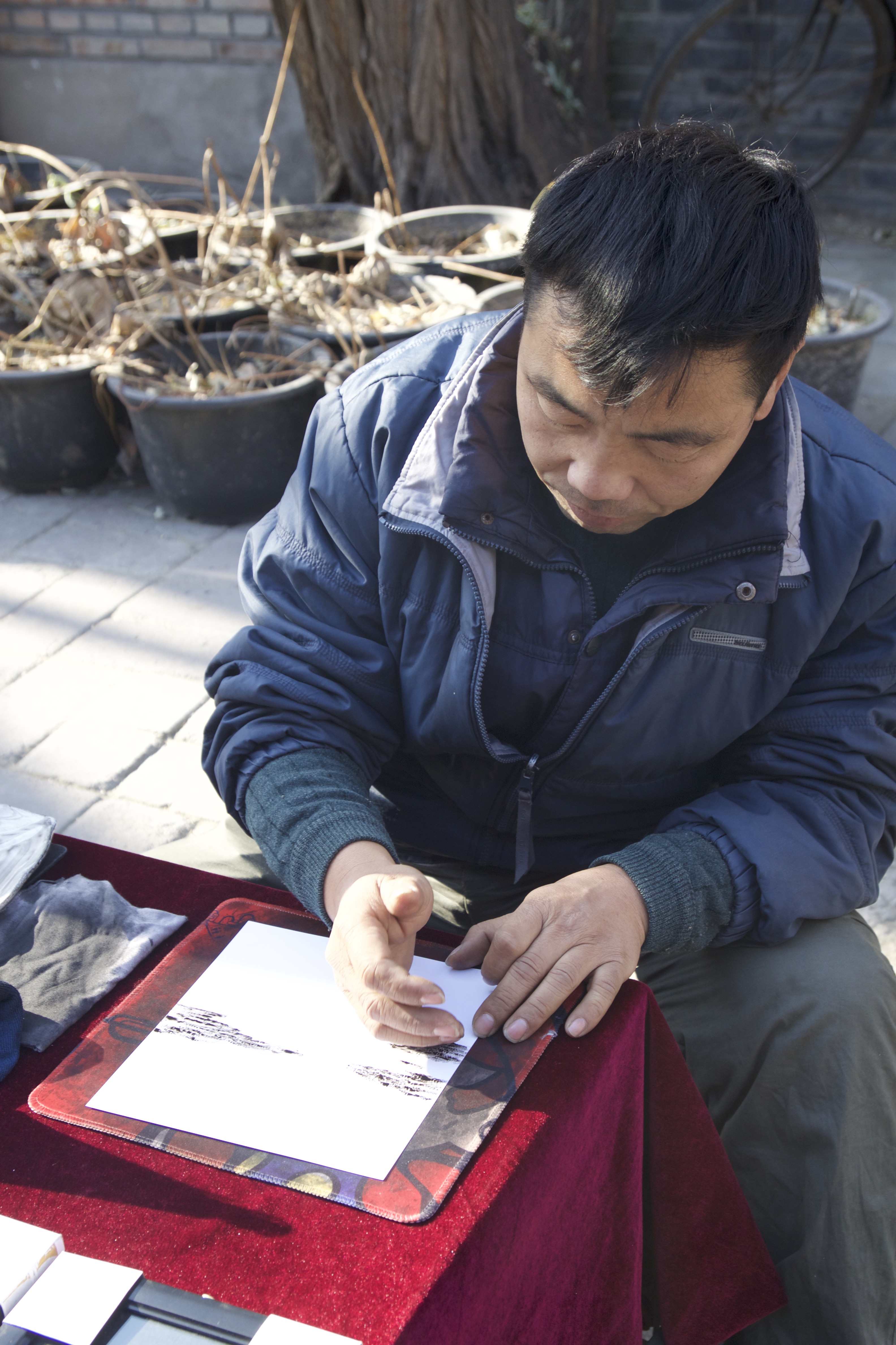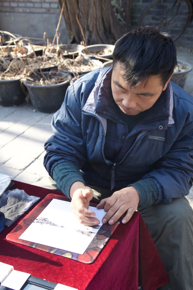 Sidewalk artists creating rapid works on request were a minor presence on my visit to 798 in May 2016. On this visit, they were very common. December 9, 2017. Photograph by Carrie Hertz.