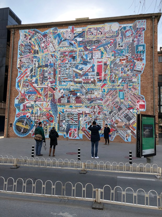 The big new (to us) mural in 798 is a map of the district. It is a magnet for “I was there” photography. December 9, 2017. Photograph by Kurt Dewhurst.