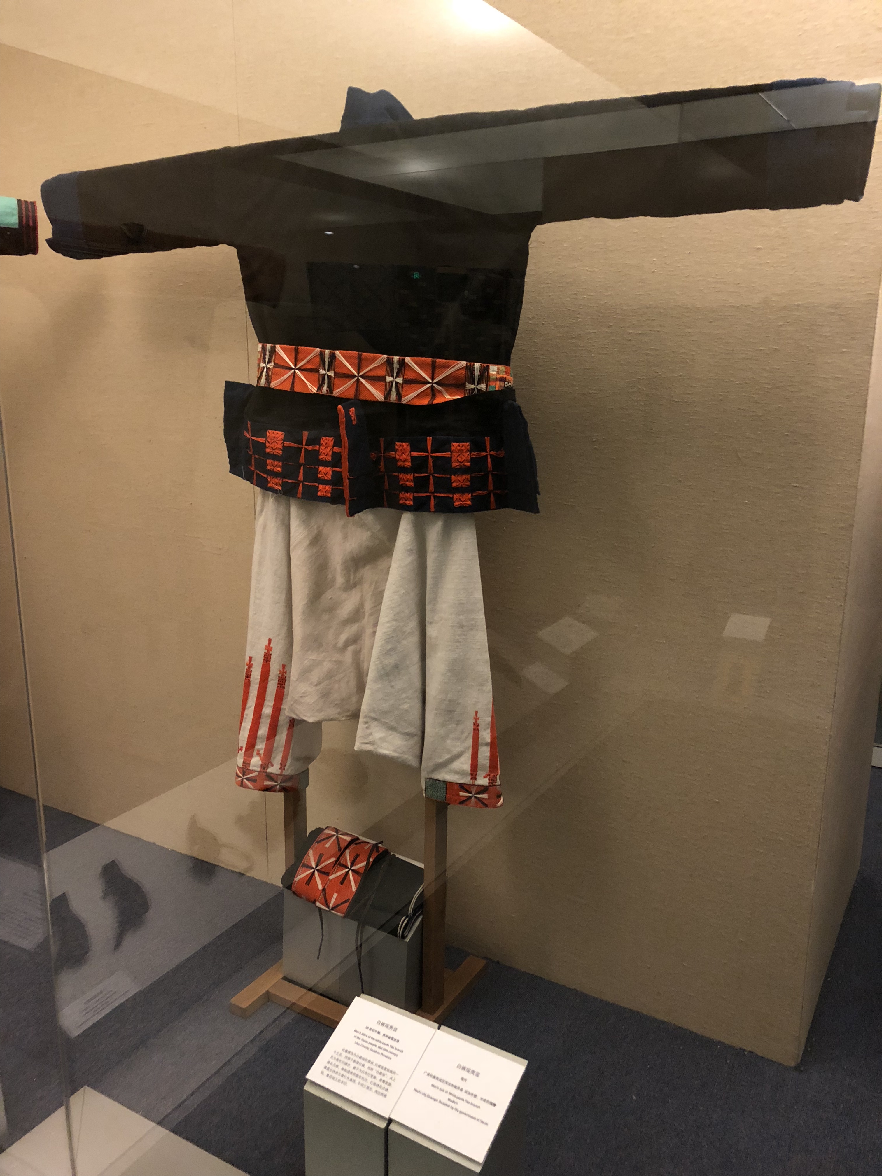 The “Men’s attire of the white-pants Yao branch of the Yaozu people” at the Museum of Ethnic Costumes. December 9, 2017. Photograph by Jason Baird Jackson.
