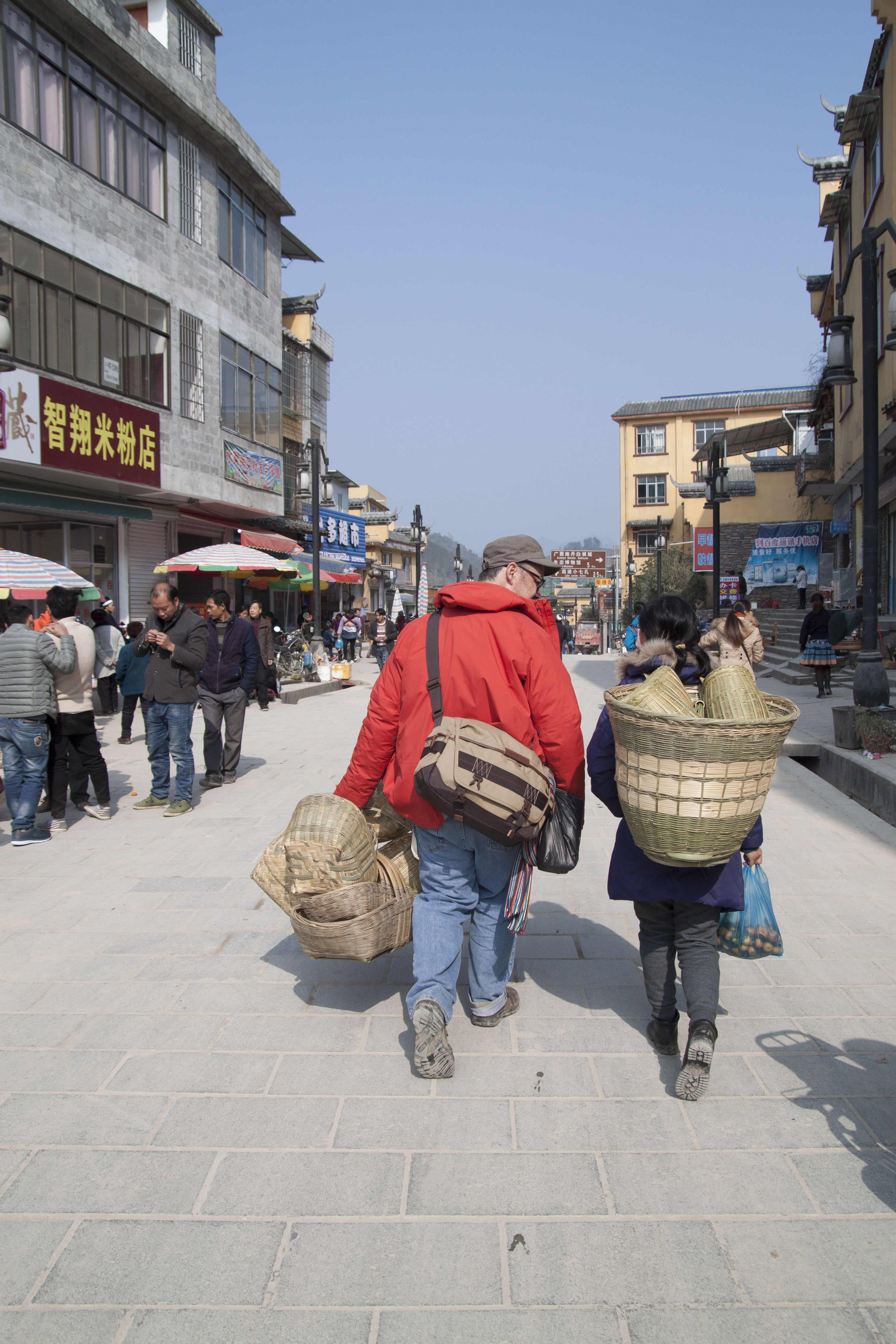 Jason Baird Jackson (L) and Lijun Zhang (R) carry baskets (and oranges) purchased on market day in Lihu town. December 16, 2017. Photograph by Carrie Hertz.