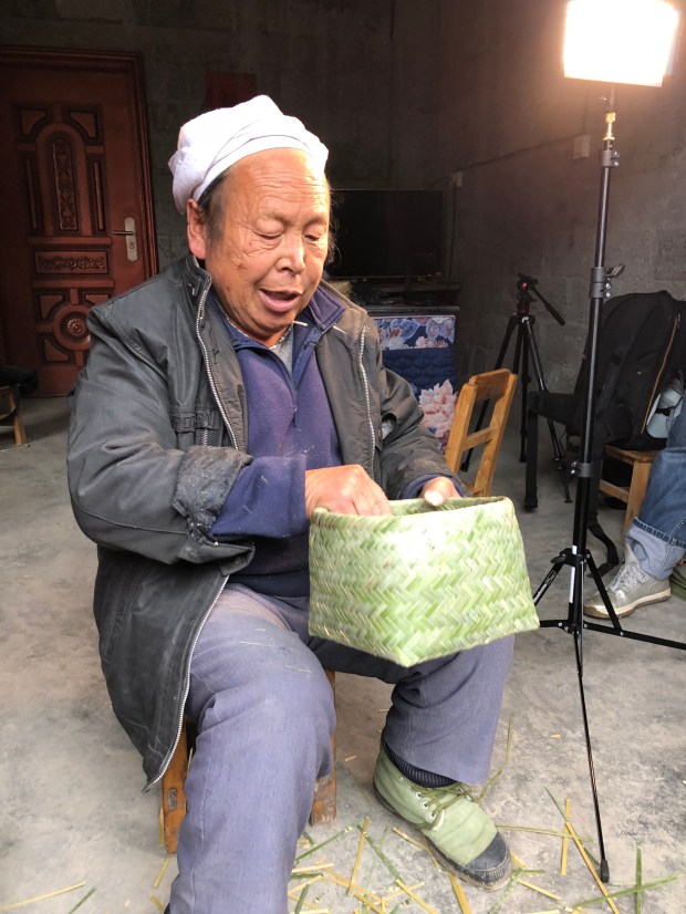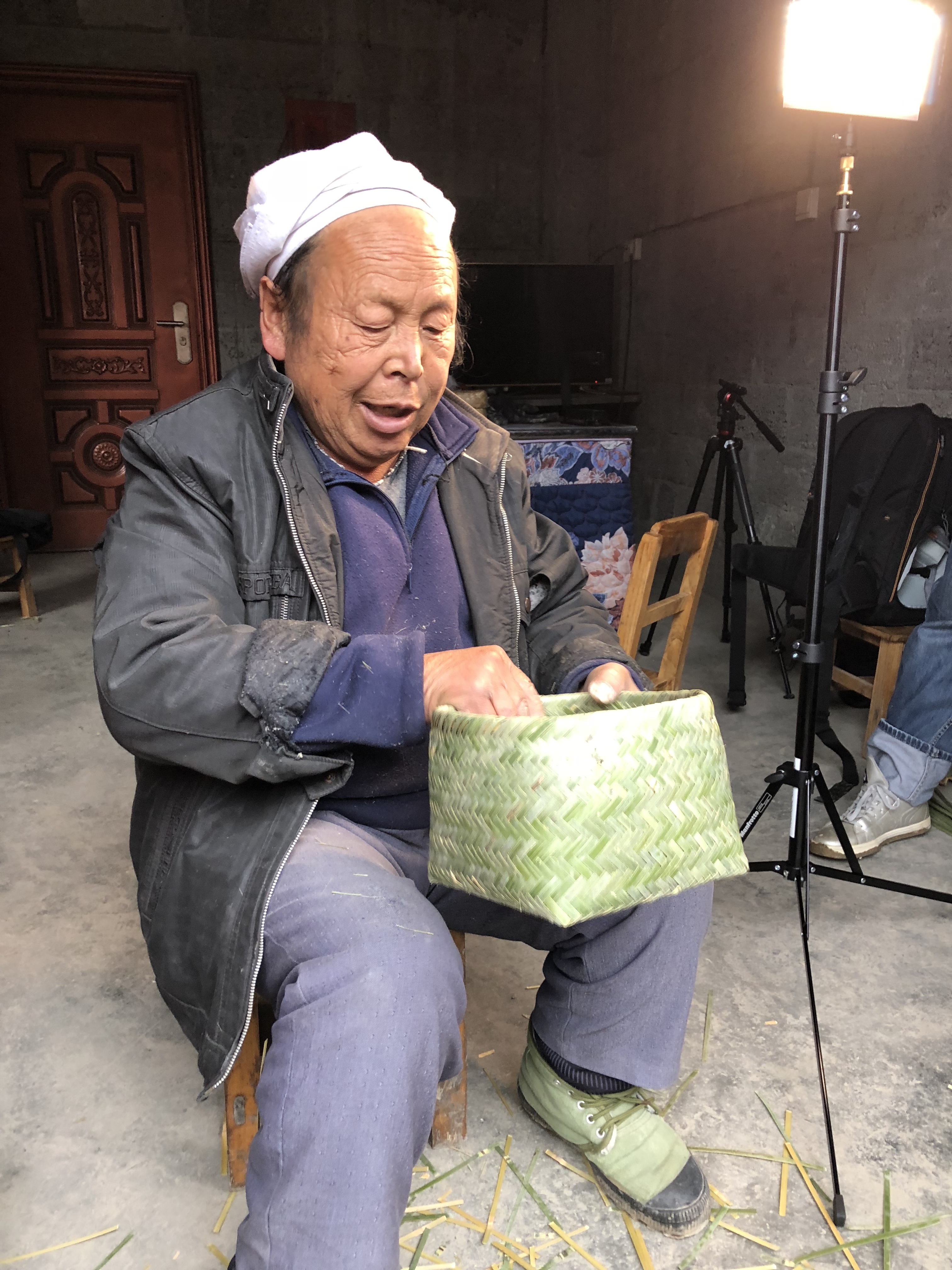 Mr. Li Guicai finishes the double-woven bottom portion of his rice basket. December 14, 2017. Photograph by Jason Baird Jackson.