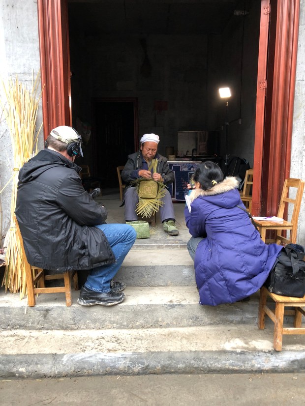 Mr. Li Guicai works on the double-woven lid of his rice basket. Jon Kay (L) Zhang Lijun (R). December 14, 2017. Photograph by Jason Baird Jackson.