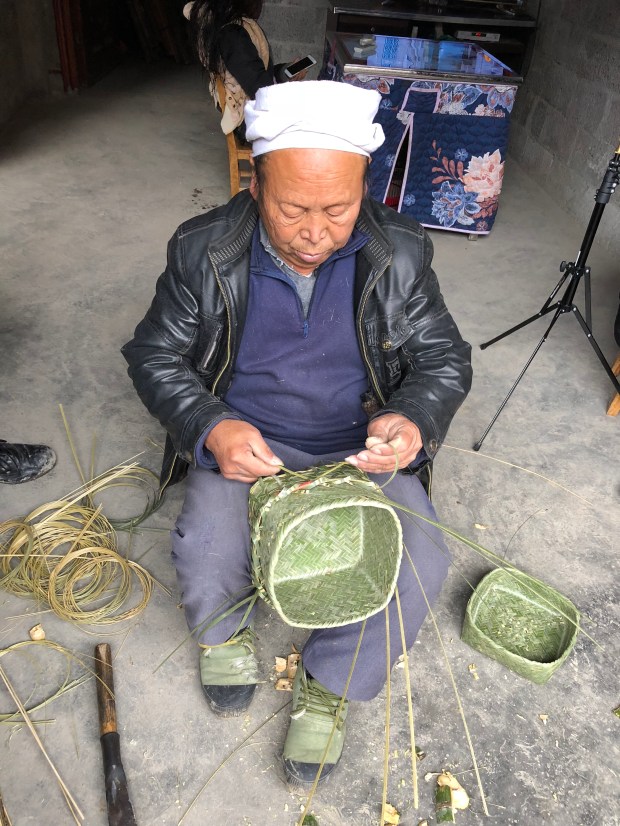 During his second day of work on it, Mr. Li Guicai added the functional and decorative base to the double-woven sticky rice basket with lid. December 15, 2017. Photograph by Jason Baird Jackson.