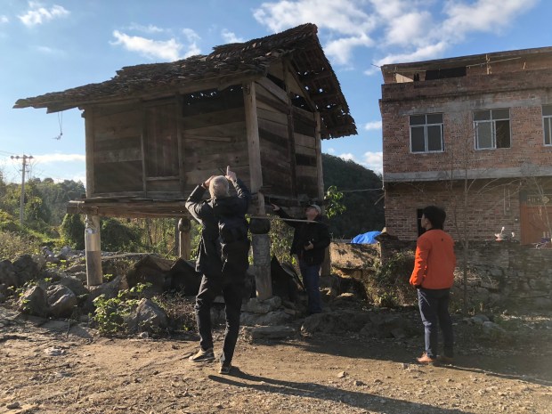 Measuring and photographing a rectangular wood-walled grainery in Manjiang village. Kurt Dewhurst (L), Jon Kay (center, measuring) and Lu Chaoming (R). December 15, 2017. Photograph by Jason Baird Jackson.