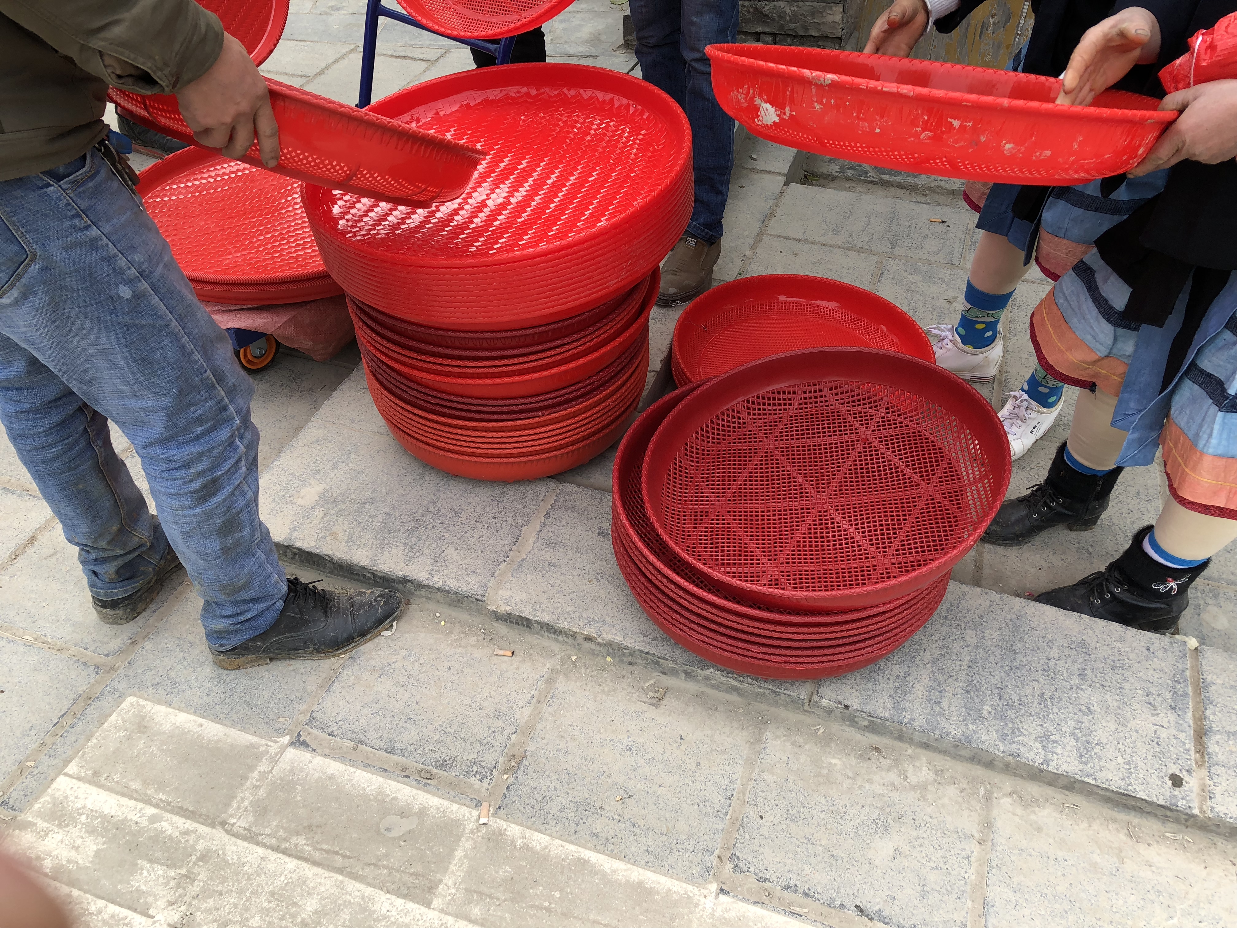 Skuomorphs on market day in Lihu town! These plastic trays and sifters attempt to preserve the appearance of their basketry counterparts while filling the same functions. While cheaper, we were told that they do not hold up as well as bamboo, especially when exposed to light. (A familiar problem also known to museum workers.) December 16, 2017. Photograph by Jason Baird Jackson.