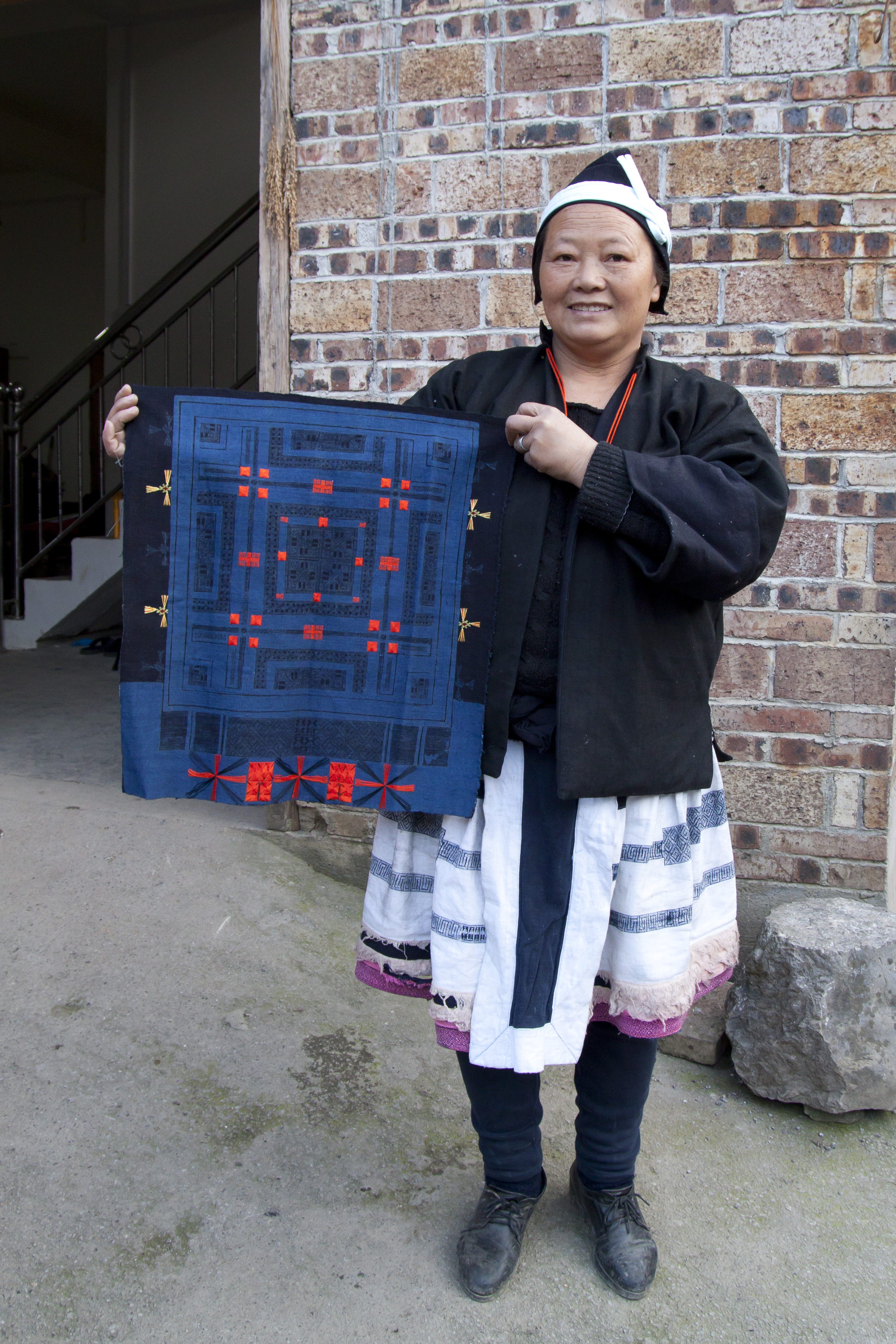 He Jinxiu holding up a woman’s burial face cloth that she made, now in the collections of the Museum of International Folk Art. December 17, 2017.