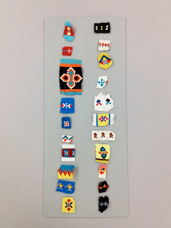 Yesterday my work with the William C. Sturtevant collection focused on the material culture side of his efforts to document the history, practice, and significance of the unique Florida Seminole art form known as “patchwork.” Basically, I organized and quickly looked at a couple of hundred patchwork samples such as those arrayed in the image presented here.