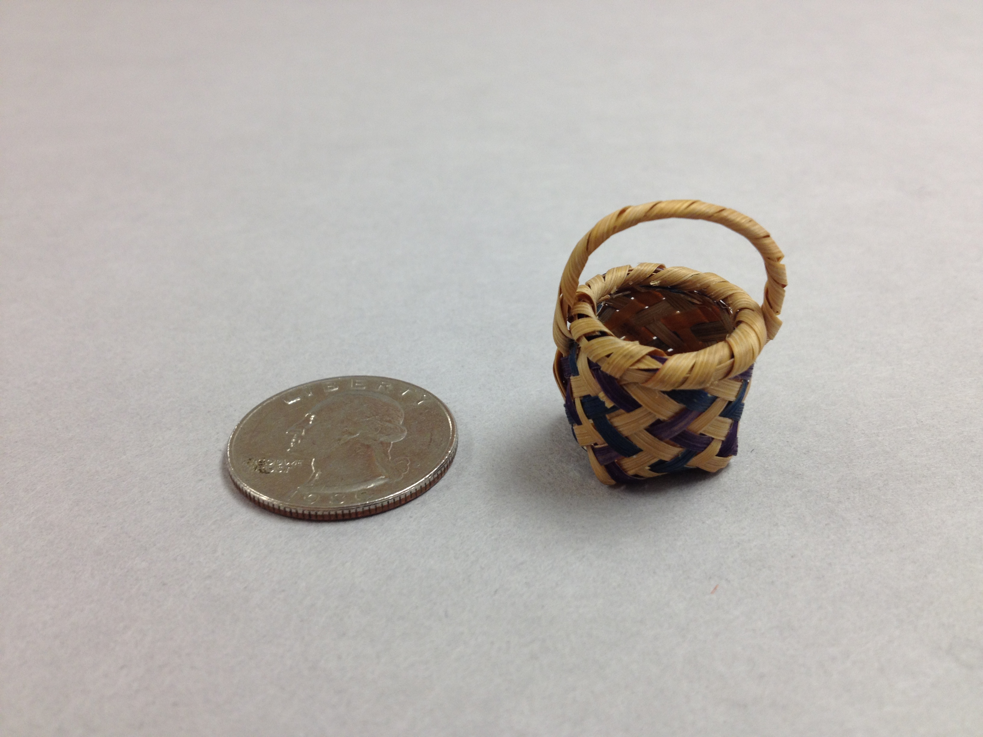 When wearing my curator hat, I have seen how ubiquitous love of tiny baskets seems to be, at least among fans of hand made objects. While I am sure that some engineer is doing nano-scale weaving already, tiny-scale seems good enough for fans of Native American basketry. The best known heroes in this area are the basket weavers of California, particularly the Pomo with their amazing feather covered baskets, but the art of the tiny basket has also been pursued in the native South. This impulse is reflected in this Choctaw basket by “Sweeny Willis” that was collected by John Mann Goggin among the Choctaw residing near Philadelphia, Mississippi. Ms. Willis’s name is spelled “Sweenie” elsewhere, such as in the records associated with pottery that she made that is in the collections of the National Museum of the American Indian.