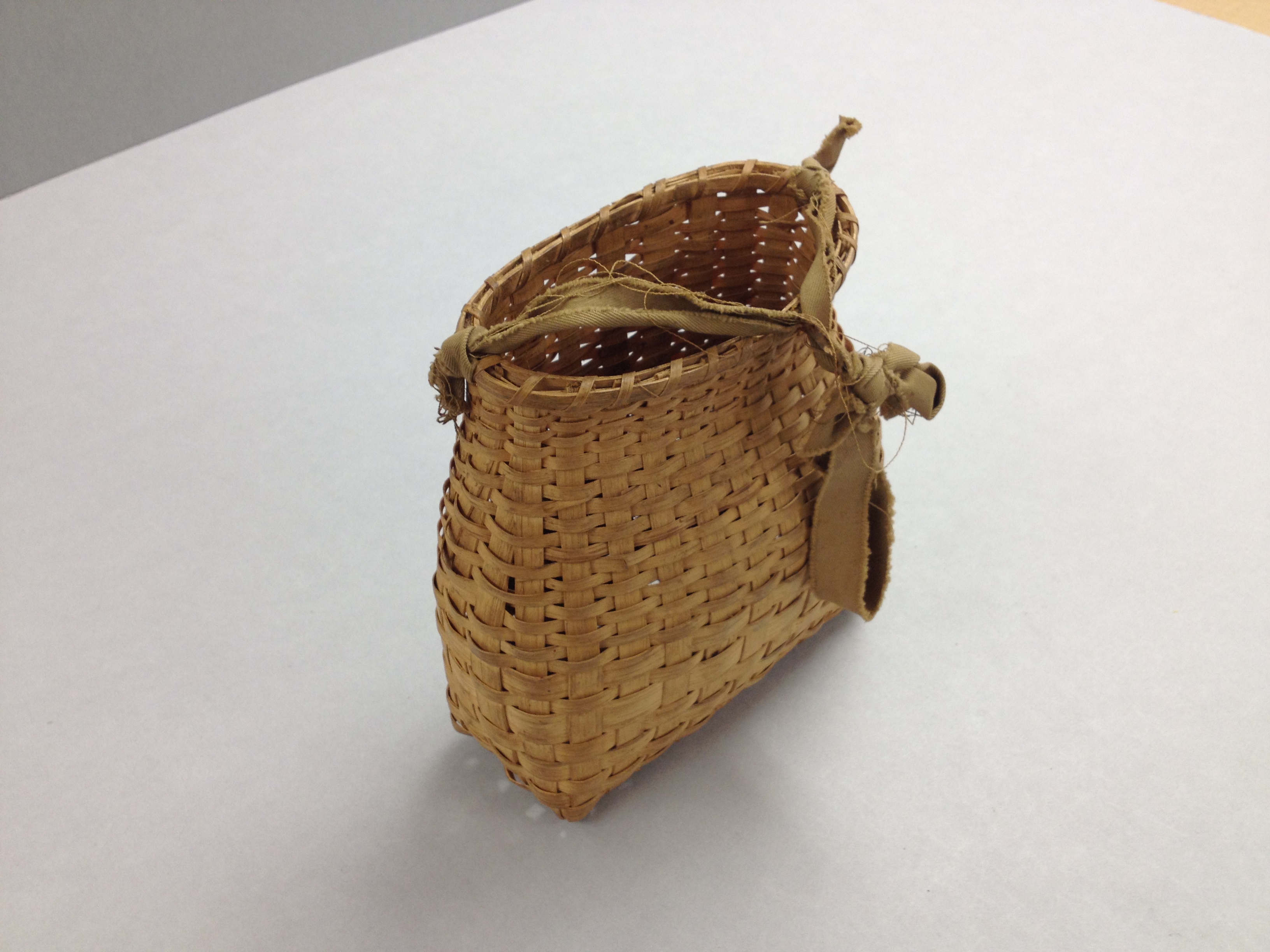 Among the used books that I just received is Baskets and Basket Makers in Southern Appalachia by John Rice Irwin (Exton, PA: Schiffer Publishing, 1982). In a chapter devoted to “The Indian Influence on Southern Appalachian Mountain Baskets” the author describes a relatively unfamiliar (to me, at this stage, at least) basket form on the basis of an example believed (to the author, at least) to be Cherokee and collected in Buncombe County, NC (p. 157). The basket discussed by Irwin is similarly shaped and similarly sized to a basket that I studied a few summers ago in the Sturtevant collection at NMNH. The splint basket that Sturtevant collected among the Eastern Cherokee is pictured here: