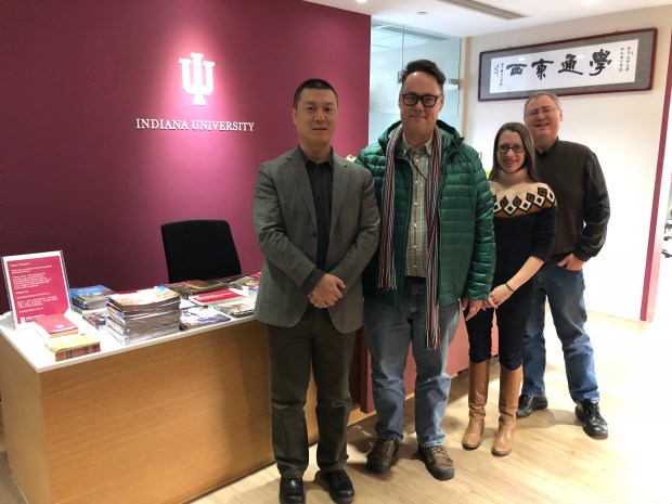 (L-R) Indiana University China Gateway Director Steven Yin hosted Jason Jackson (MMWC), Carrie Hertz (MoIFA), and Jon Kay (MMWC) at the China gateway office in Beijing. December 8, 2017.