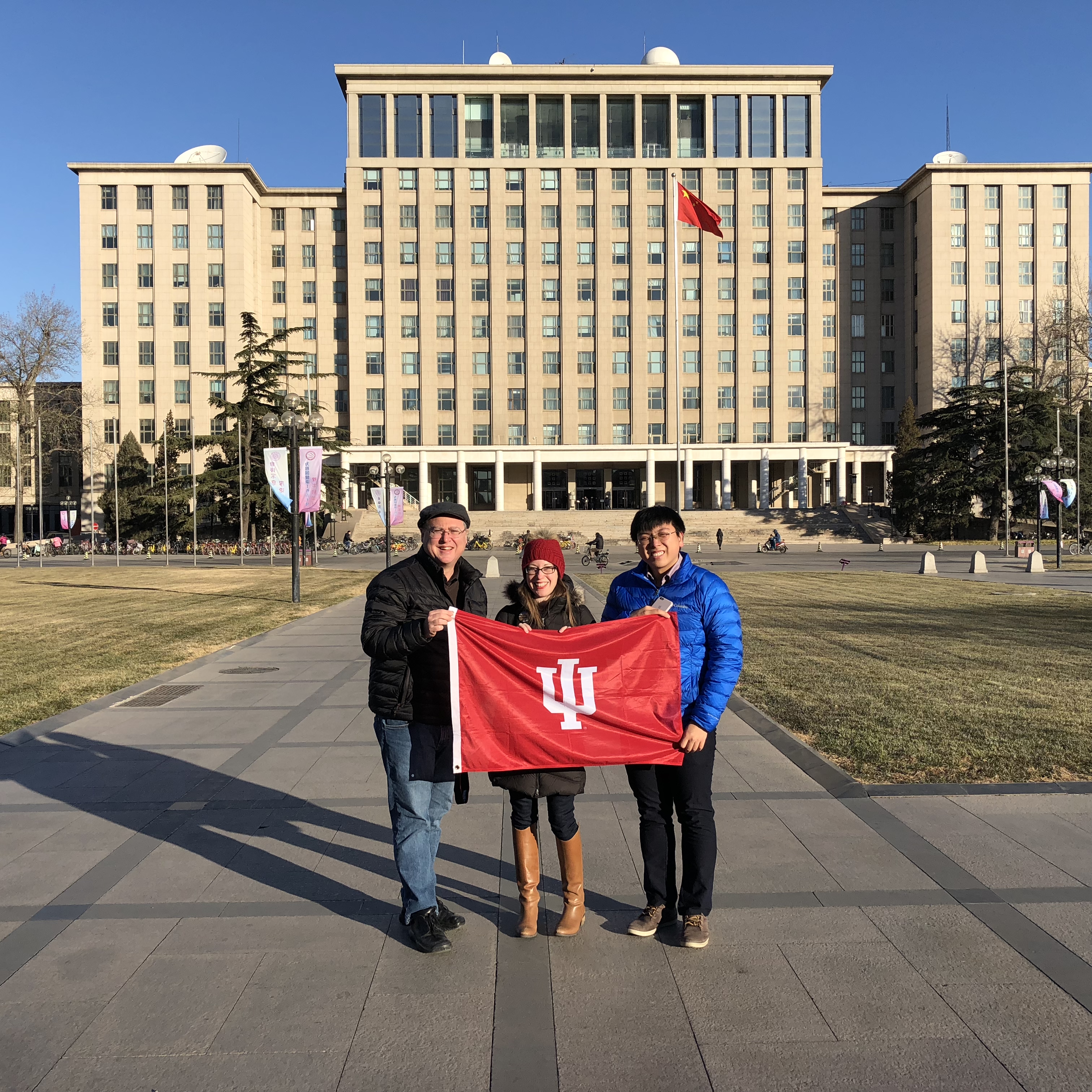 IU Alumni (L-R) Jon Kay, Carrie Hertz, and Peter Yen (IUPUI Recruitment Coordinator and Assistant Office Manager at the China Gateway) pose with the IU Flag on the campus of IU partner Tsinghua University in Beijing. December 8, 2017. Photograph by Jason Jackson.