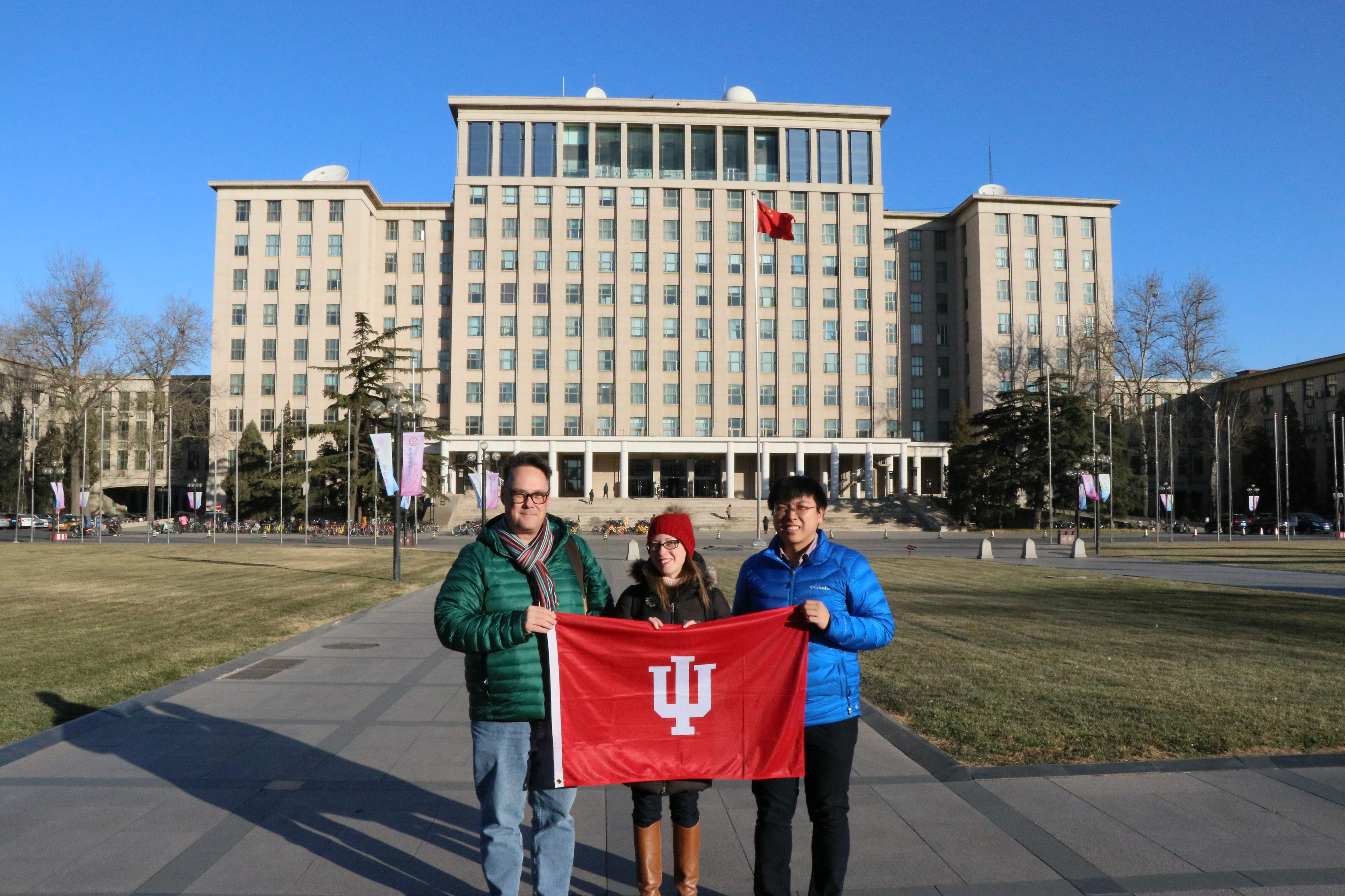 (L-R) Jason Jackson, Carrie Hertz, and Peter Yen pose with the IU Flag on the campus of IU partner Tsinghua University in Beijing. December 8, 2017. Photograph by Jon Kay.