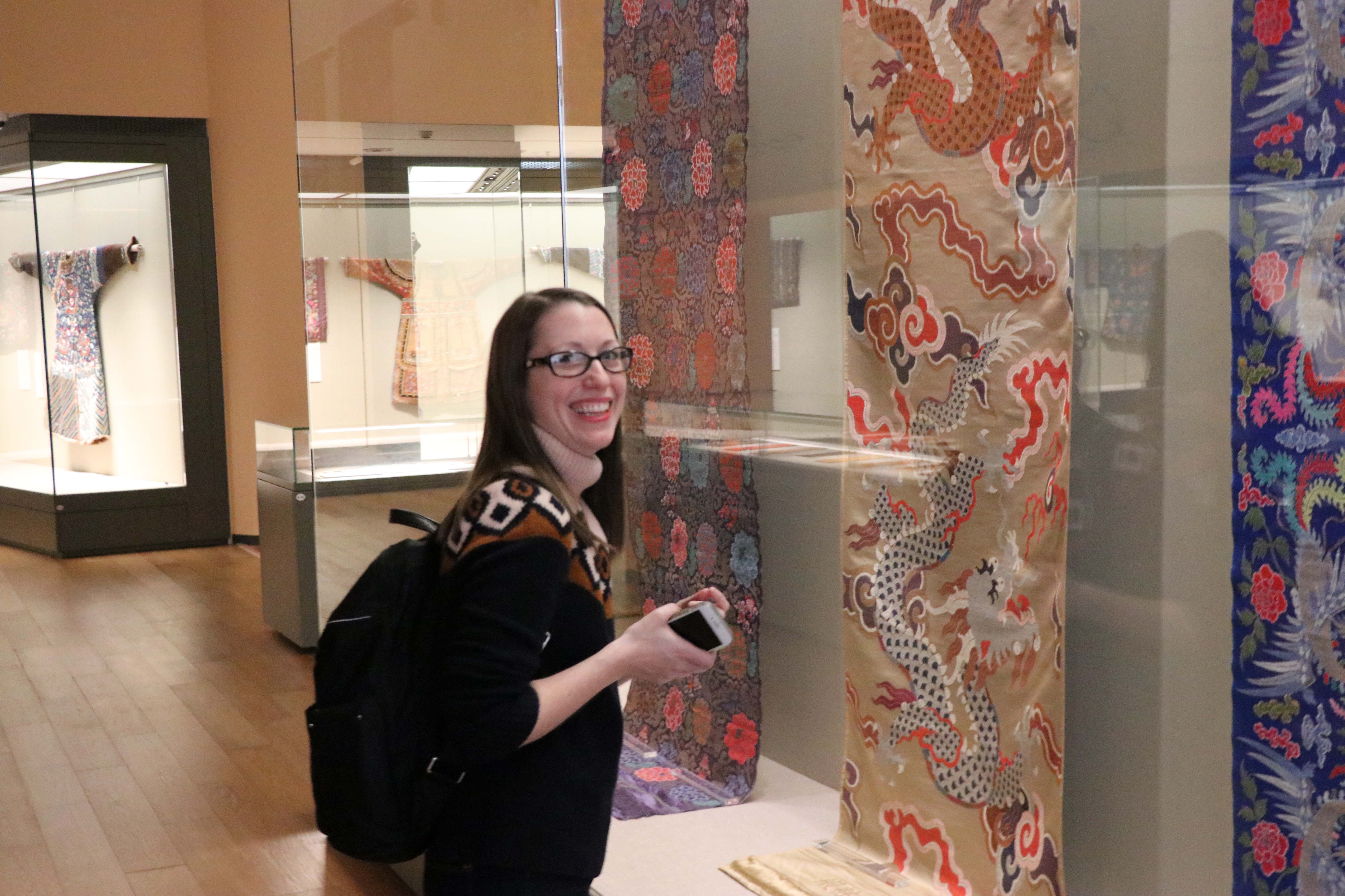 Carrie Hertz enjoys the textile portion of the “Tsinghua Treasures: Exhibition of Tsinghua University Art Museum Collection.” December 8, 2017. Photograph by Jon Kay.